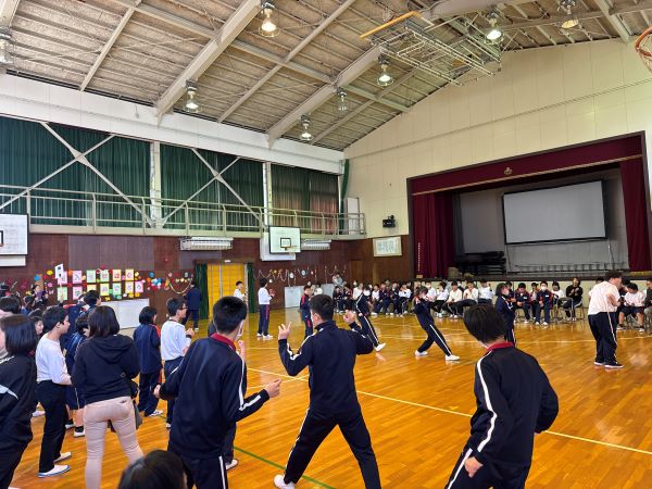 TOPICS/中学部 中学部 新入生歓迎会 2025年4月17日 中学部の新入生歓迎会を行いました。2年生と3年生が壁面いっぱいの飾りを準備して、新入生を迎え入れました。先輩たちが作業学習で作った製品をプレゼントしたり、中学部のみんなが大好きなエイサーを披露したりして、大いに盛り上がりました。先輩たちに歓迎されて1年生は笑顔を見せていました。
