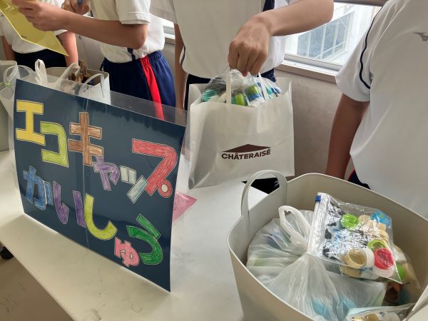 TOPICS/中学部 中学部 エコキャップ運動 2025年6月20日 中学部では、生徒会役員が毎月エコキャップ運動を行っています。中学部だけでなく、他部からもたくさんのご協力をいただき、ありがとうございます。 エコキャップの回収と同時に、毎月のめあても中学部の各学級に配付しています。どの学級に配付したか、しっかり丸をつけてチェックしています。