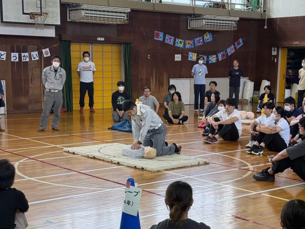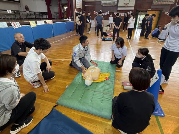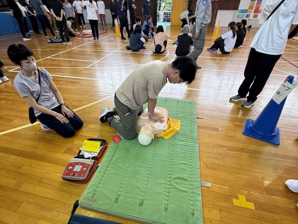 尾三消防本部南出張所より消防隊員の方をお招きして、職員対象の救急そせい法の研修をしました。消防隊員の方から心肺そせい法の手順とAEDの使用手順について説明を受けた後、グループに分かれて実技訓練を行いました。実技訓練では、事故発生からAED使用までの一連の流れを確認し、適切に対応できる技能を身に付けることができました。