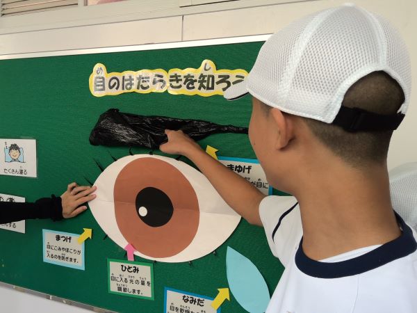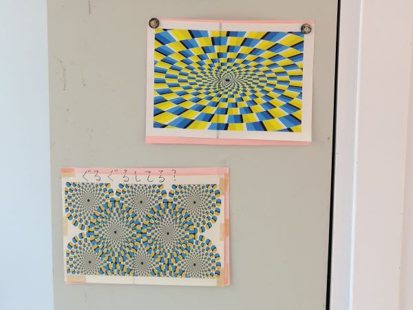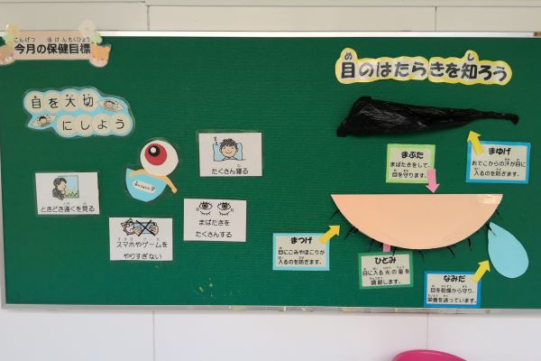 TOPICS 保健室前の廊下掲示 2025年10月10日 10月の保健目標「目を大切にしよう」に合わせた掲示です。 目のはたらきや、目を大切にする方法、止まっているのに動いて見える不思議な絵を掲示しています。