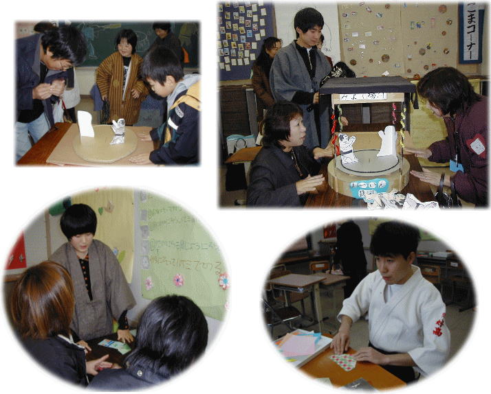 紙ずもう、こま、けん玉など昔の遊びを体験するコーナーです。 みんなで遊んで、折り紙道場も人気でした。