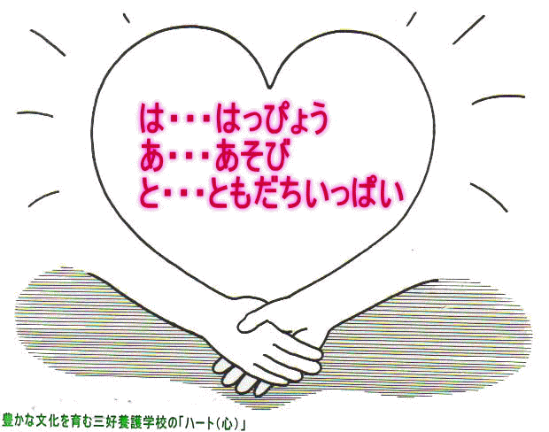 平成14年12月5日(木)から12月6日(金)に、第一回目文化祭である、みよしようご「はあとまつり」が行われました。これまでの学習発表会や本校の文化を継承しつつ、児童生徒と教師が一緒になって活動内容を計画してきました。小学部は生活単元学習における遊び学習を中心に、中学部では、劇発表やミュージカル、高等部では、総合的な学習の時間で取り組んできた交流学習や校外学習などの体験を生かした活動を中心に各部各学年の特色を生かした発表になりました。